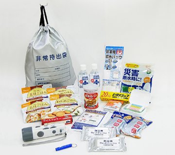 非常持出袋、5年保存水500mL×2、生命のパン(プチヴェール)、五目ごはん×2、わかめごはん×2、クッキー(プレーン)×2、ライスクッキー、ニューベンリー袋5回セット、アラーム付きLEDラジオライト、 エマージェンシーブランケット、携帯救急箱、真空圧縮セット(タオル・軍手・マスク)、ホイッスル、給水袋5L、防災用ウエットティッシュ×2、ラップ